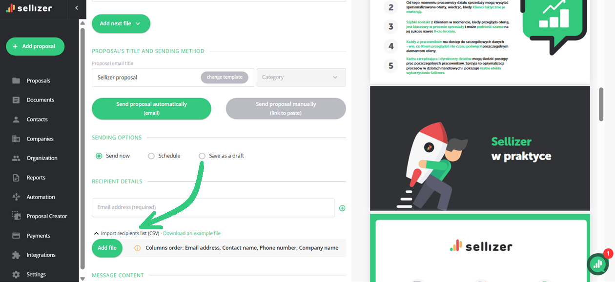 Yes. You can add recipients manually by clicking “+” next to the Recipient details field or import a list of contacts from a CSV file. Please note, however, that it is not possible to use both contact import and manual recipient entry at the same time.