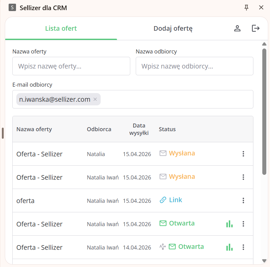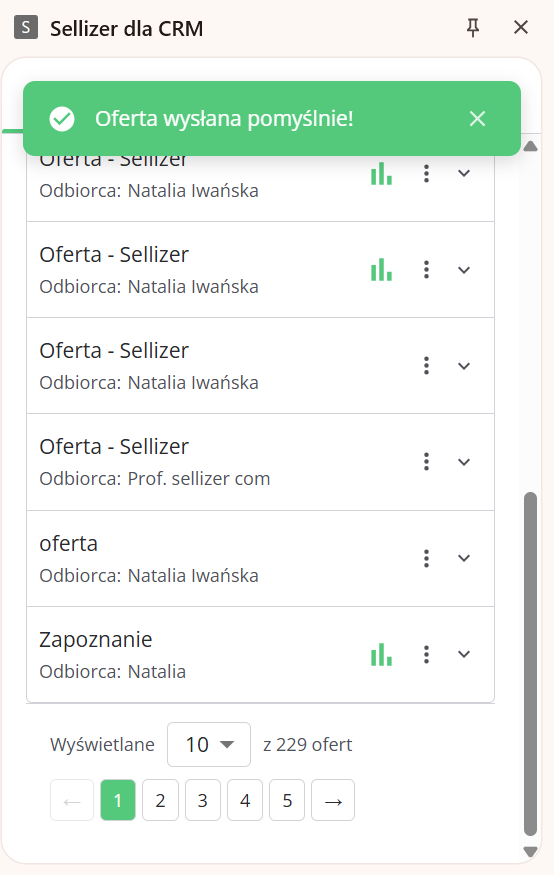W zakładce „Lista ofert" możesz na bieżąco śledzić statystyki wysłanych ofert. Jeśli odbiorca otworzy ofertę, przy niej pojawi się zielona ikona statystyk — kliknij ją, aby przejść do szczegółów.