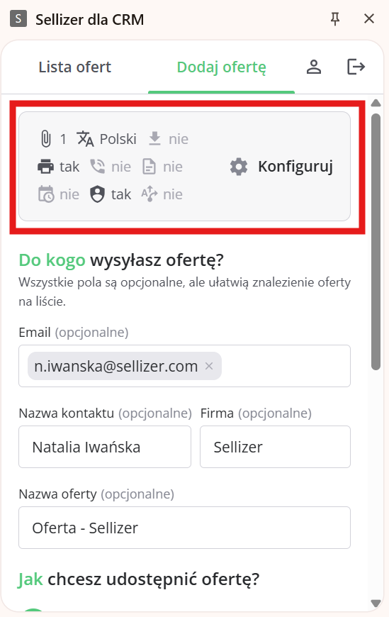 Przed wysyłką możesz skonfigurować ofertę — np. dodać datę ważności, pop-up “Zamów kontakt”/“Zamów wzór umowy” lub automatyczne follow-upy.