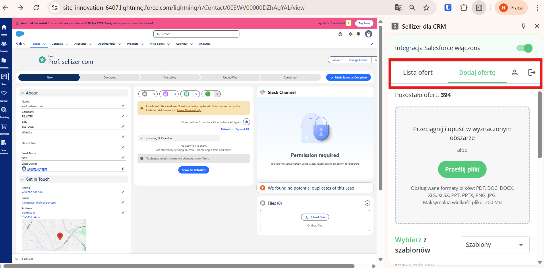 Zaloguj się do Salesforce, a następnie kliknij ikonę puzzla i zaloguj się do Sellizera. Rozszerzenie wyświetli się jako sidebar po prawej stronie — bezpośrednio obok widoku CRM.