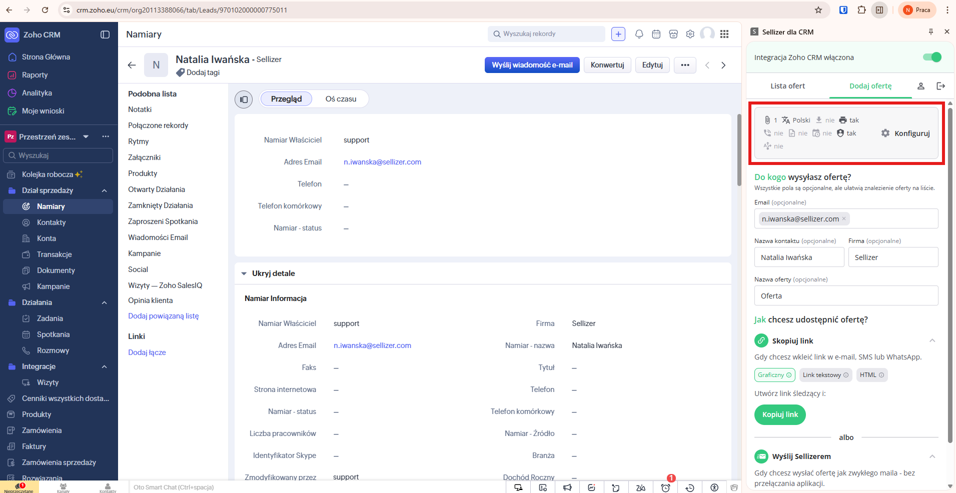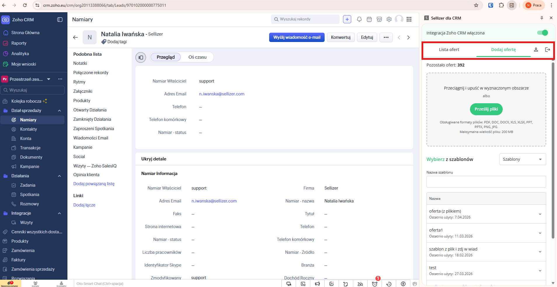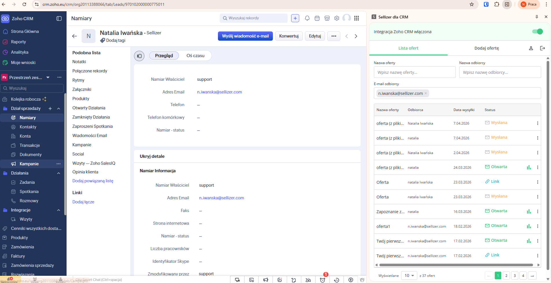 Zaloguj się do Zoho, a następnie kliknij ikonę puzzla i zaloguj się do Sellizera. Rozszerzenie wyświetli się jako sidebar po prawej stronie — bezpośrednio obok widoku CRM.