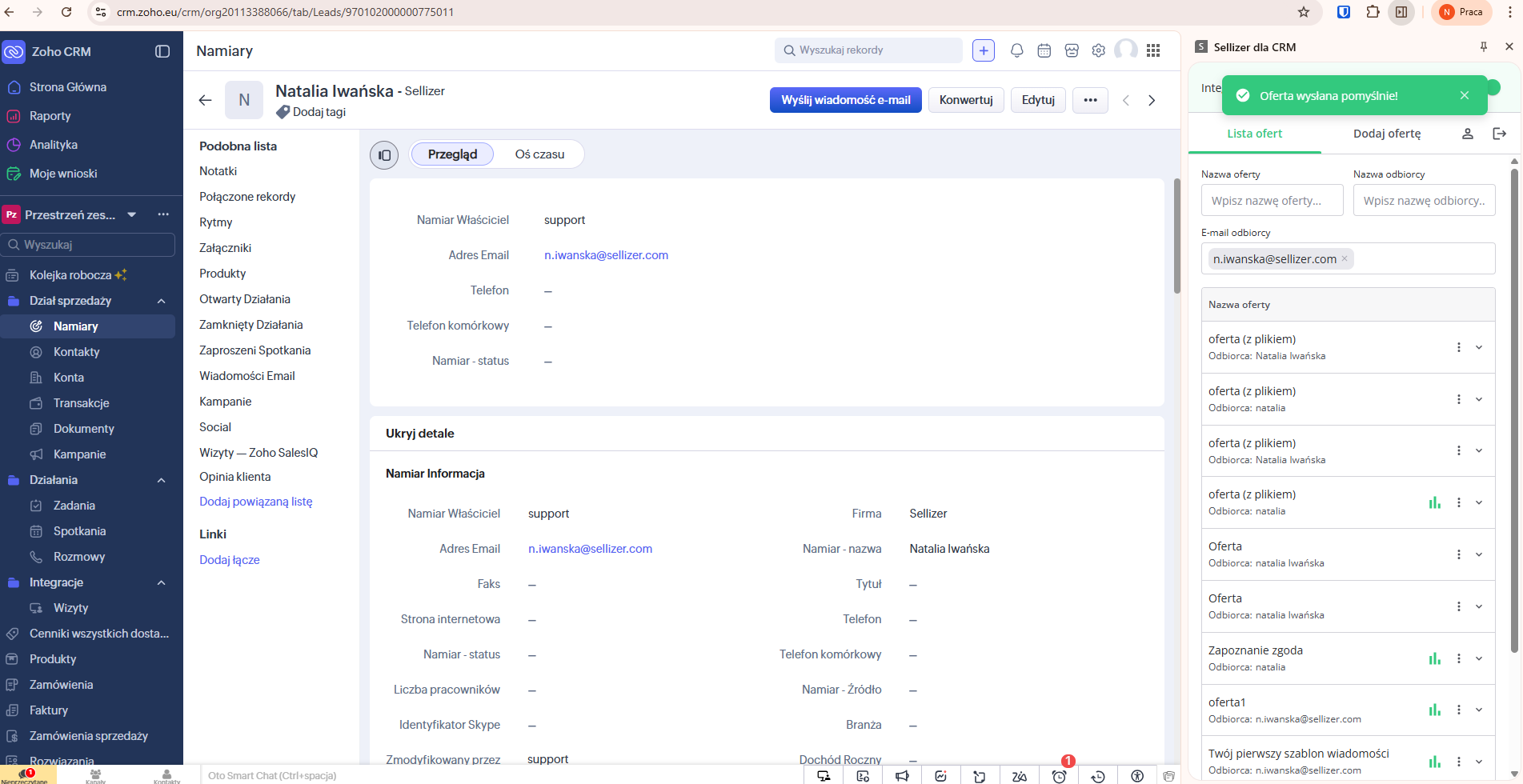 a) Chcesz przejrzeć wysłane oferty? Przejdź do zakładki „Lista ofert" — znajdziesz tam wszystkie oferty wysłane do danego kontaktu w tej szansie sprzedaży.