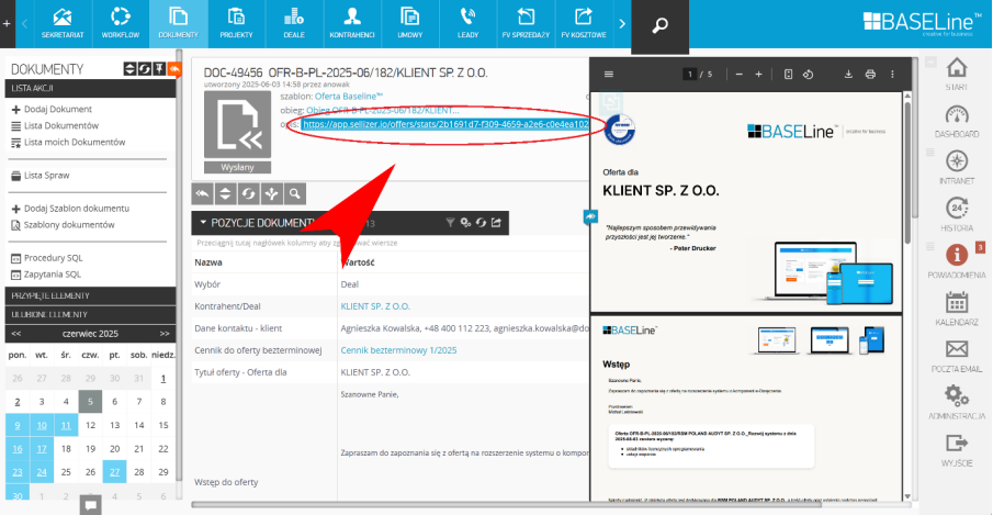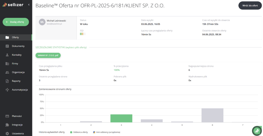 9. Link do śledzenia statystyk dostępny jest bezpośrednio z poziomu oferty w systemie Baseline™, co z kolei umożliwia szybki dostęp do informacji bezpośrednio z poziomu CRM-a.