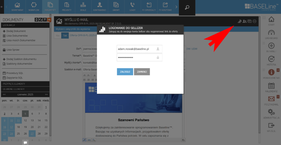 5. Nas interesuje ta druga opcja. Aby wysłać ofertę z CRM do Sellizer’a i pobrać jej link, handlowiec uwierzytelnia się wprowadzając jednorazowo dane logowania.