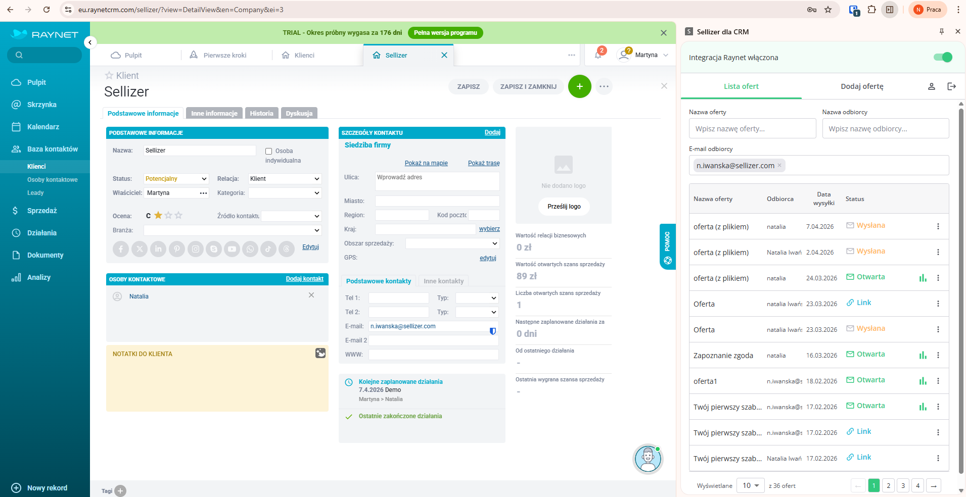 Zaloguj się do Raynet, a następnie kliknij ikonę puzzla i zaloguj się do Sellizera. Rozszerzenie wyświetli się jako sidebar po prawej stronie — bezpośrednio obok widoku CRM.