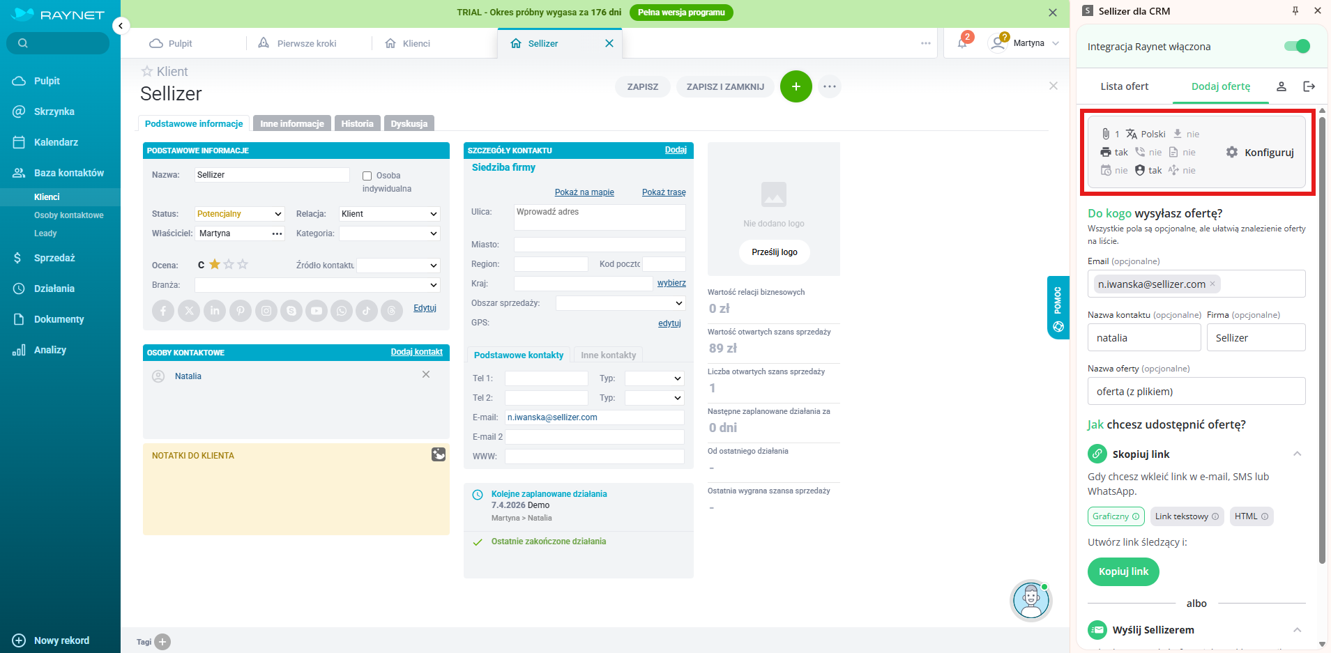 Przed wysyłką możesz skonfigurować ofertę — np. dodać datę ważności, pop-up “Zamów kontakt”/“Zamów wzór umowy” lub automatyczne follow-upy.