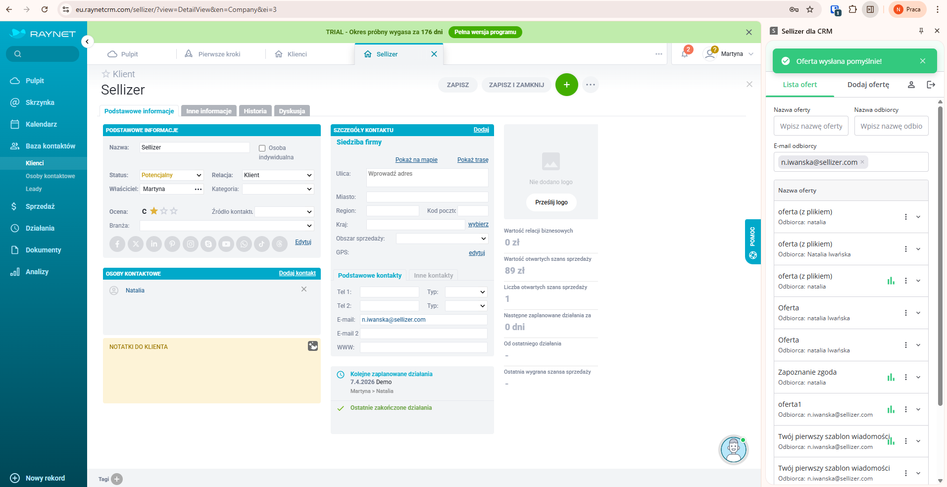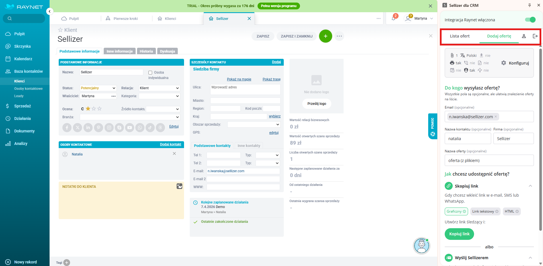 a) Chcesz przejrzeć wysłane oferty? Przejdź do zakładki „Lista ofert" — znajdziesz tam wszystkie oferty wysłane do danego kontaktu w tej szansie sprzedaży.