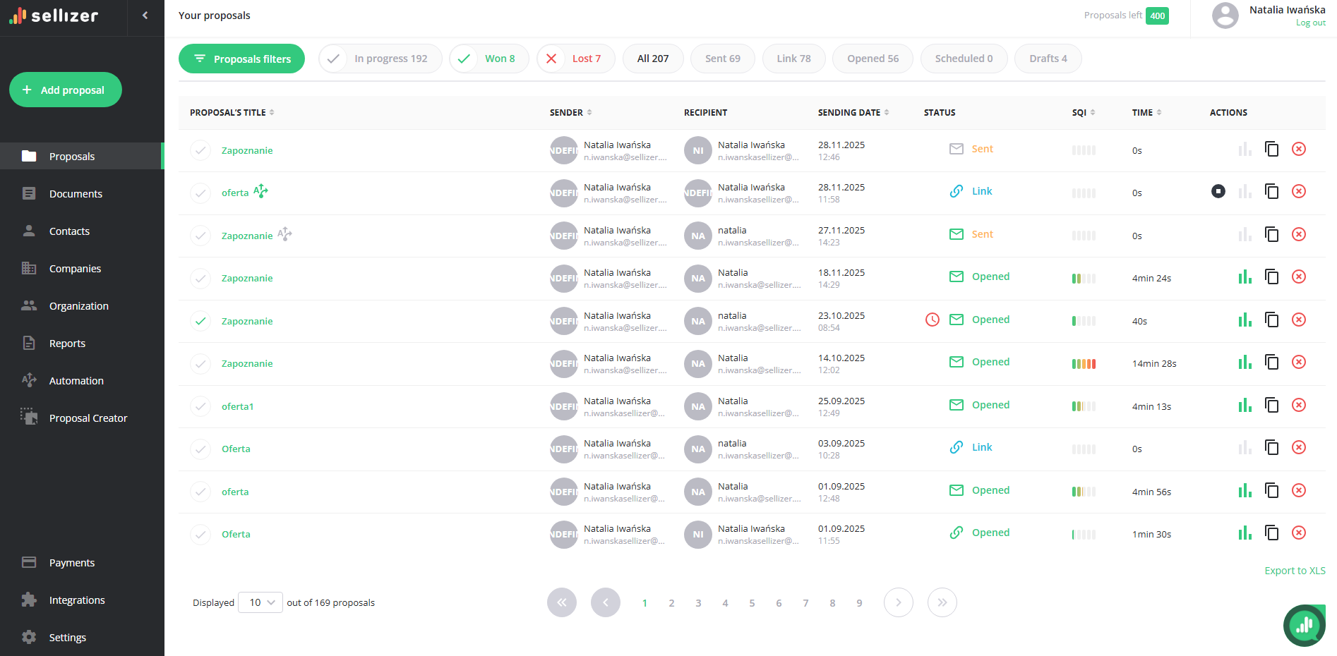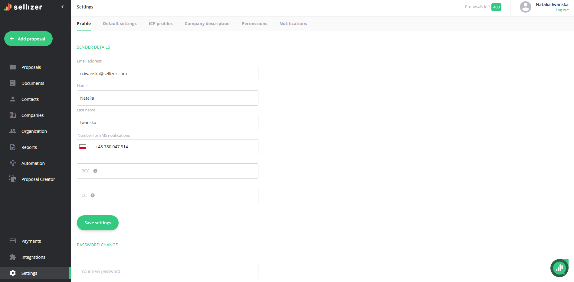 By clicking on the user's name or icon in the upper right corner, you will be taken to the Settings subpage, where you can edit your profile, personalize proposals, and integrate with your e-mail account.